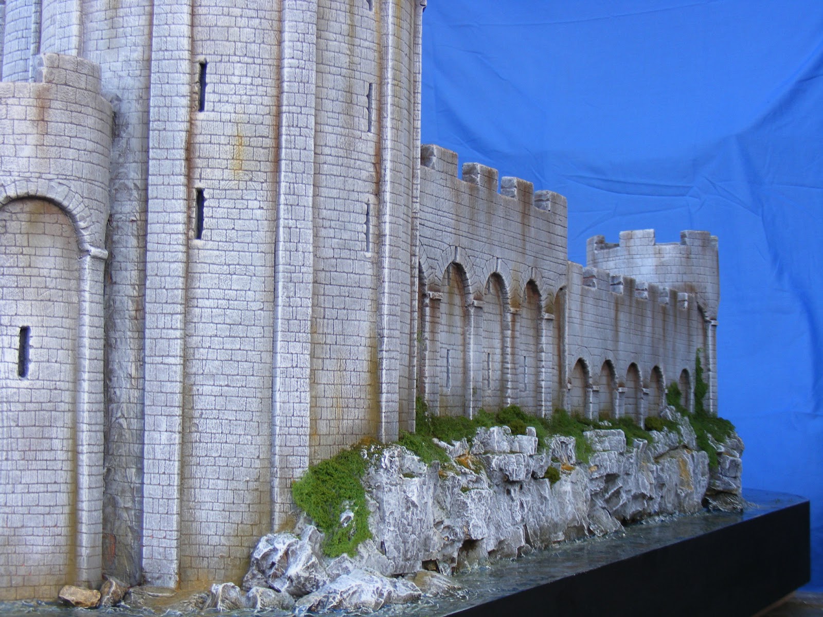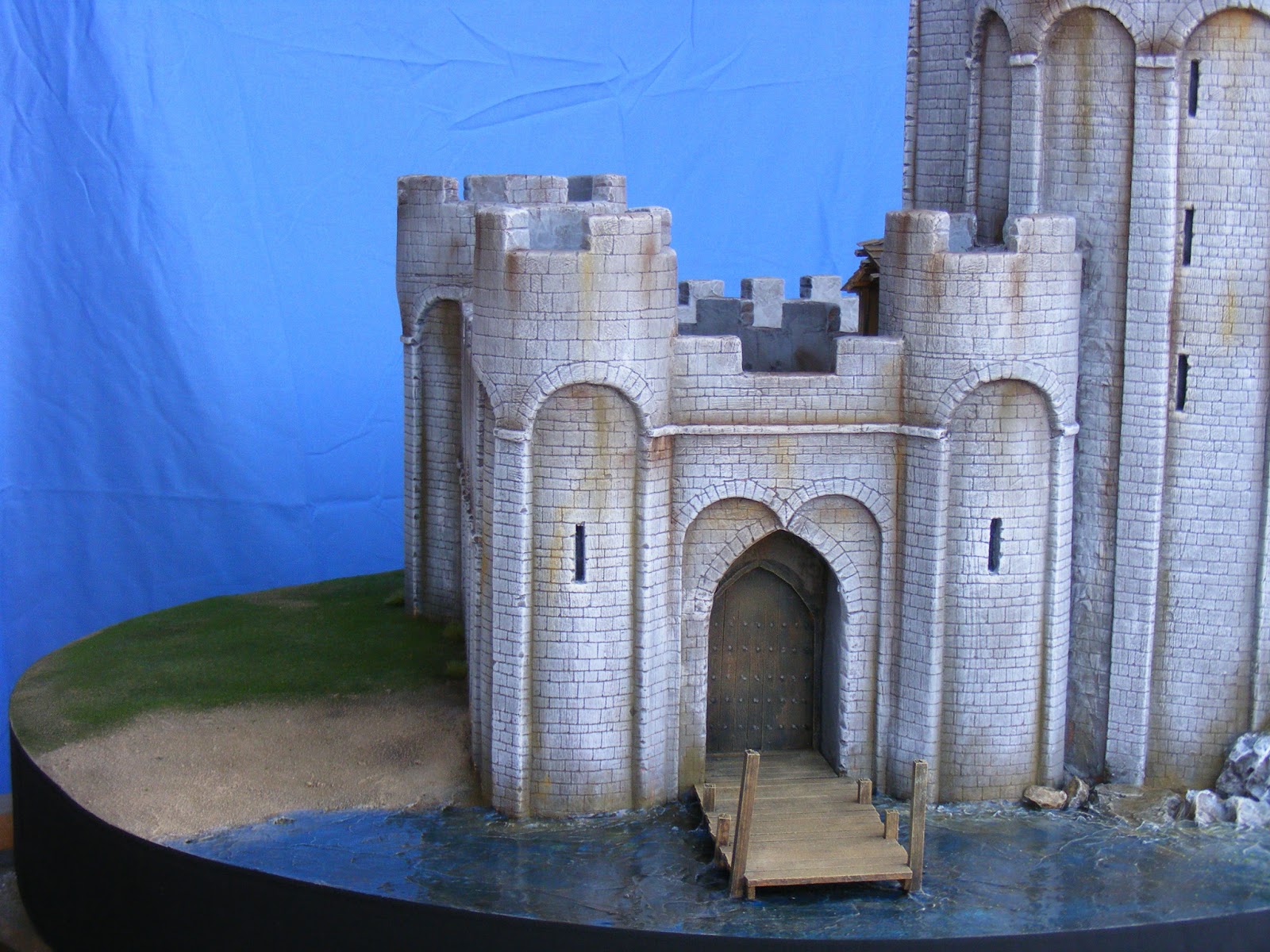 Overall, the job took about 4 months to complete and hours spent on it added up to about 250 over those 4 months. The castle was set into an oval base about 6 feet long and 3 feet wide. The castle needed to have space around it for the enemy to be displayed so overall the castle was probably 5 feet long and 2 feet wide. It was over 2 feet high at it's highest point.